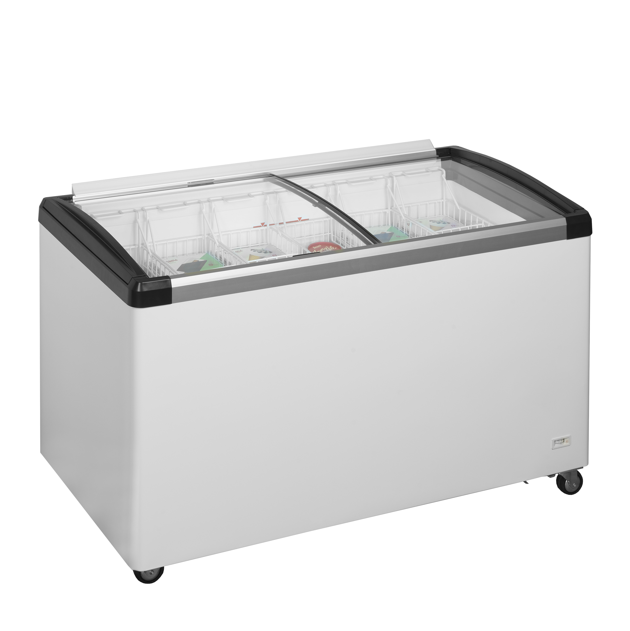 IDB-serien av glassfrysar är solid byggda med en aluminiumram på fram- och baksidan. De lätt böjda skjutlocken i glas har robusta handtag som också fungerar som ändar på den övre ramen, vilket tätar frysen väl och förhindrar att luft tränger in och ut. Den har en fantastisk LED-belysning på framsidan för att belysa de frysta varorna, och den levereras med ett komplett set korgar.