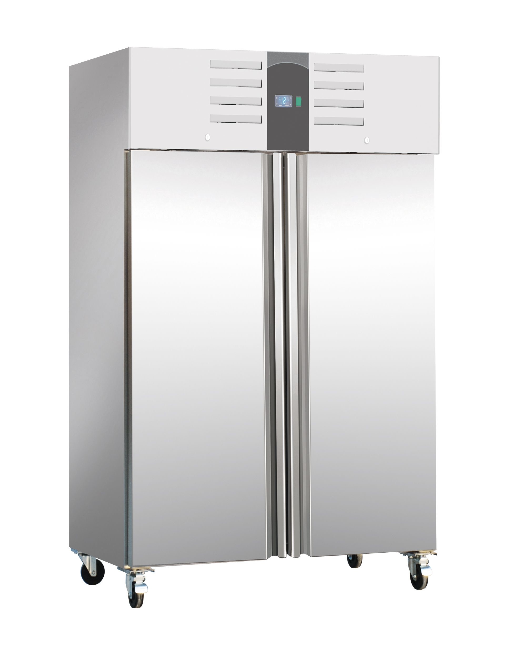 Rymligt dubbelkylskåp på 1200 liter med rostfri konstruktion, digital temperaturkontroll och statisk kylning med fläkt. Utrustat med två självstängande dörrar, 6 GN-galler och automatisk avfrostning.