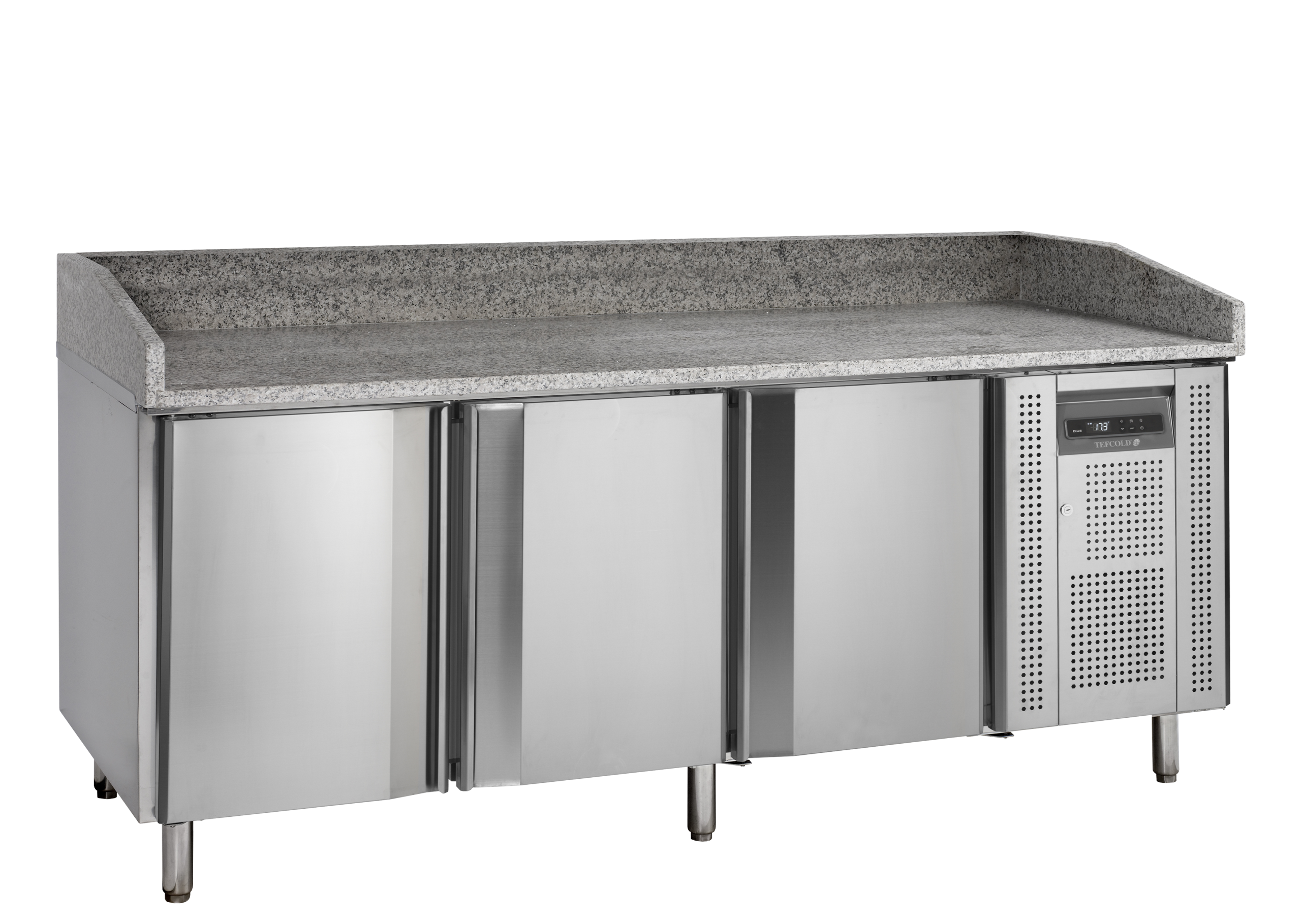 PT-serien med pizzabord är tillverkad i rostfritt stål SS304. Den har en bordsskiva i granit som är perfekt för att göra pizzor, eftersom graniten håller sig sval och gör det svårare för degen att fastna i bordsskivan. Den finns i flera olika storlekar med två eller tre dörrar. Den kan även fås anpassad med lådor. Levereras med eller utan påsats för GN-kantiner – påsatserna kan även monteras i efterhand.