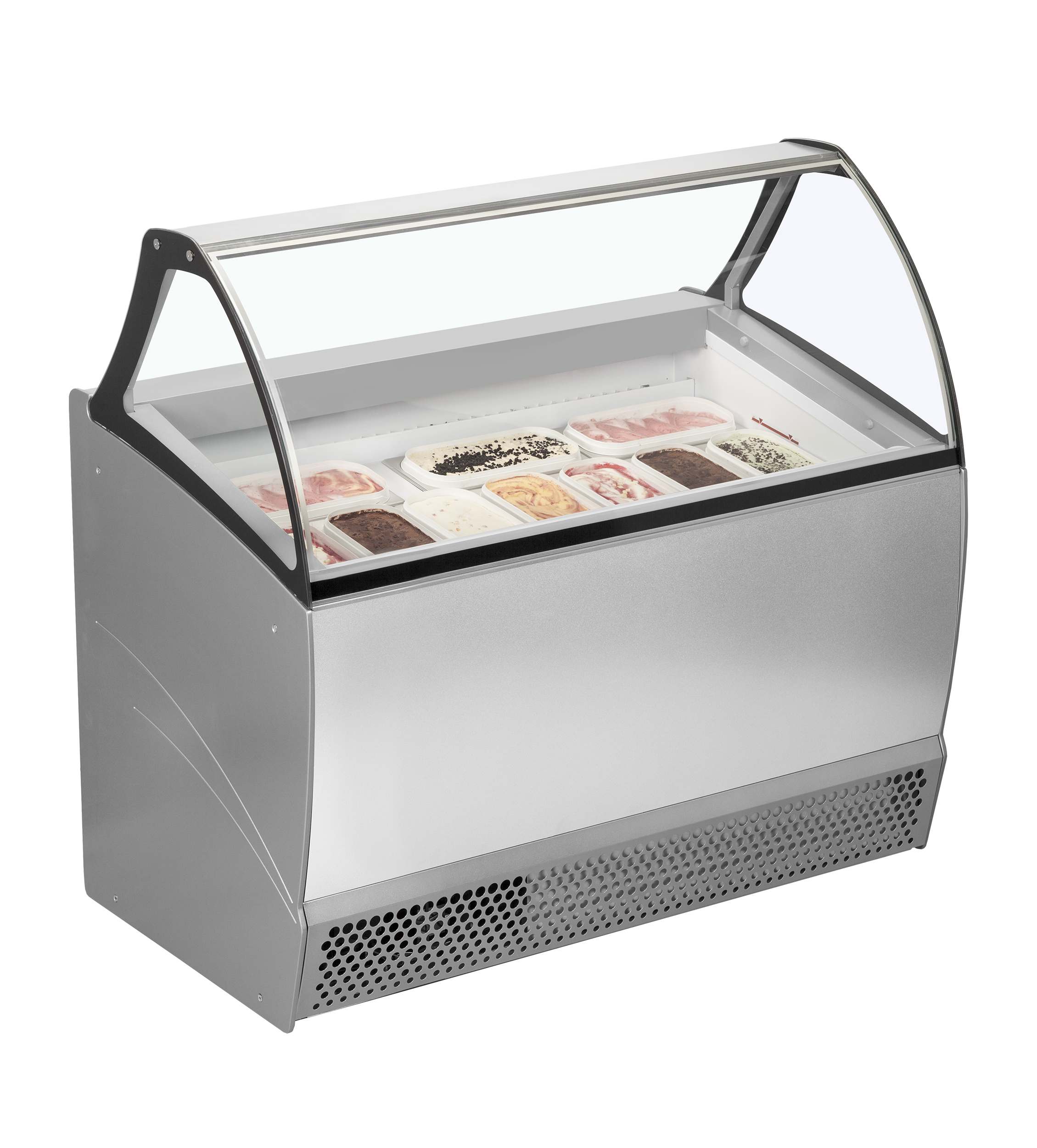 Bermuda-serien finns i två displaystorlekar, antingen 10 eller 13 plåtar. Skåpet är utrustat med ett ventilerat kylsystem som håller glassen i idealisk serveringstemperatur. Dessutom har enheten en separat kyld underförvaring. Bermudas smäckra design med välvt glas är både elegant och praktisk, med en uppvärmd yta för att motverka kondens. Med sin fantastiska kombination av kvalitet och prisvärdhet är den ett populärt val bland säljare av glass.